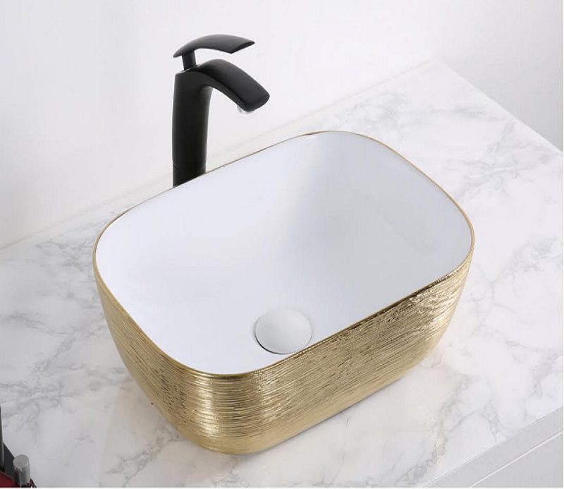 Раковина CeramaLux D1333H130 бело-золотая 46 смПодходит для ванных комнат различной планировки в современном стиле и отличается стильной и изящной формой.Материал: санфаянс.В комплекте поставки: раковина.
