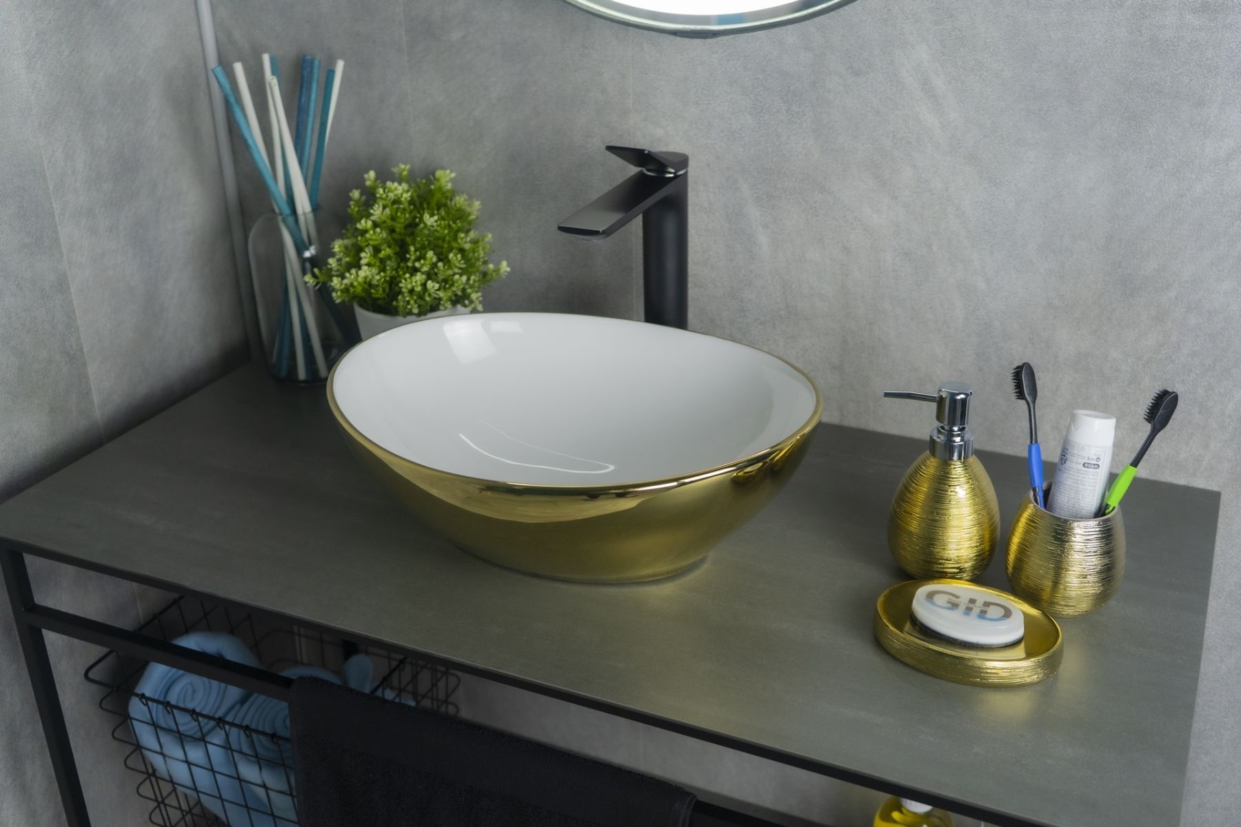 Серия Lago овальной формы — это испанское качество, соответствующее современным европейским требованиям. Раковина накладная GiD Nc999 — уникальная модель в стильном белом цвете с золотистым ободком, созданная для современного интерьера. Её овальная форма гармонично дополняет пространство, создавая акцентный элемент в ванной комнате. Мелкопористая керамика отличает раковину долговечностью, устойчивостью к загрязнениям и простотой в уходе. Благодаря отсутствию отверстия под смеситель раковина позволяет реализовать различные дизайнерские решения по размещению смесителя. Накладной монтаж обеспечивает лёгкость установки и сохраняет максимум пространства на столешнице.