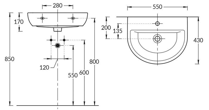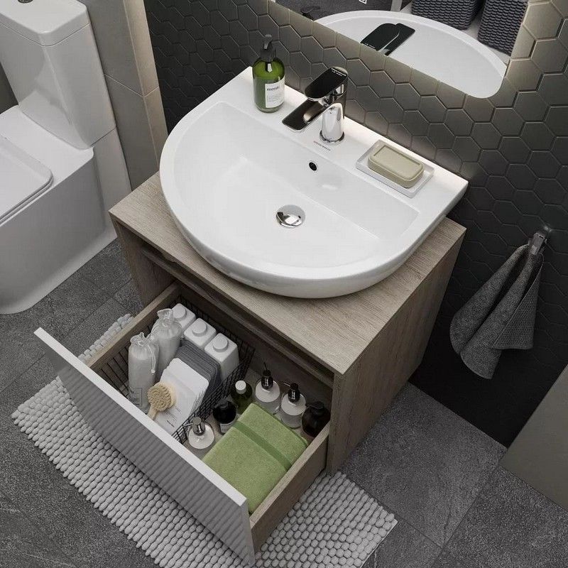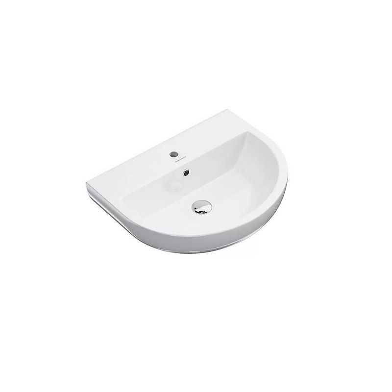 Подвесная раковина в белом глянцевом цвете с переливным отверстием и хромированной накладкой, ширина 55 см. Может использоваться с подвесными тумбами PRO