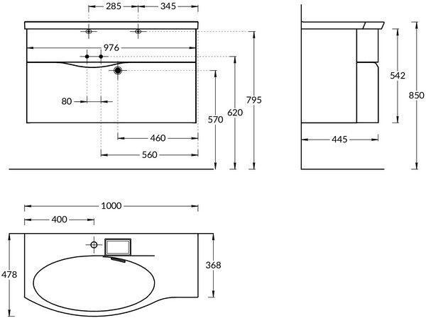 Изогнутая мебельная раковина без необходимости использования донного клапана, ширина 100 см. Отверстие слив\перелив спрятано в небольшой бокс, закрытый керамической крышкой с бортиком. Чаша раковины расположена слева. Сочетается с тумбой Riva.