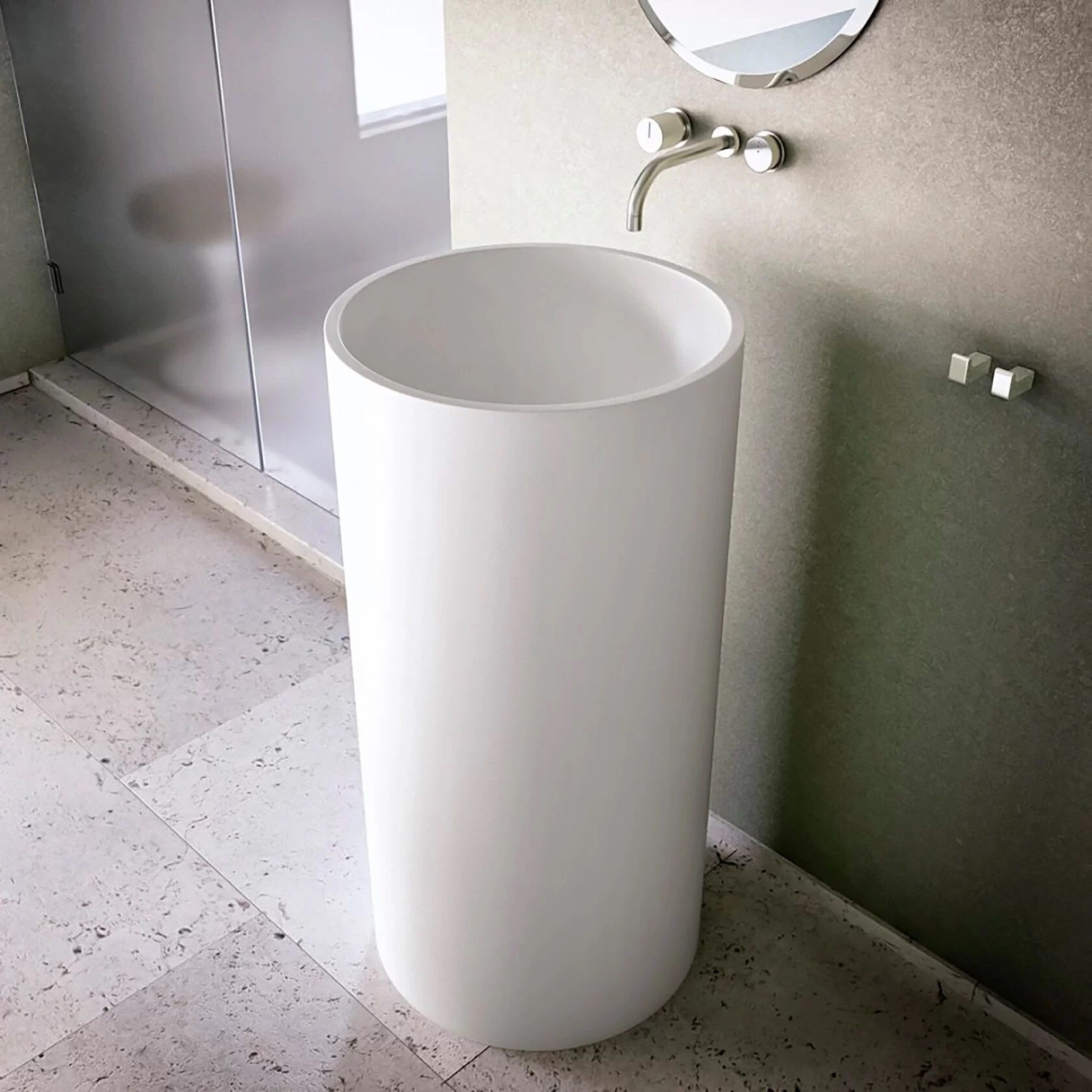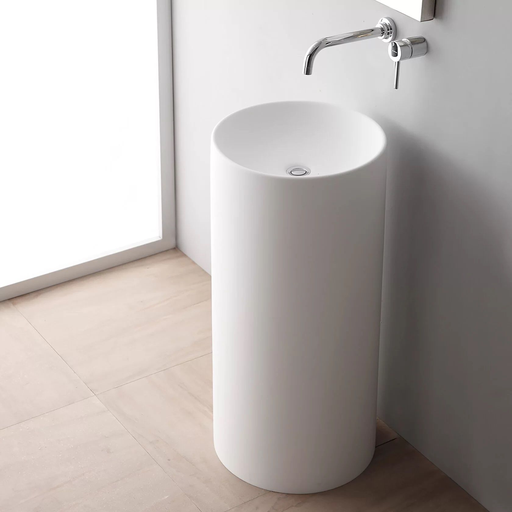 Раковина из искусственного камня для ванной комнаты. Похожие модели – Montebianco Pisa Cono и Pisa Rubinetto. Модель напольного размещения. Не требует сложных манипуляций при инсталляции, устанавливается обособленно от предметов мебели. Благодаря большой видимой площади белоснежно-матовой, бархатистой поверхности великолепно выглядит в интерьере, является самостоятельной композицией. Часто устанавливается в сан.узлах ресторанов и баров, а также частных домах с ванными комнатами большой площади. Высота раковины оптимальна как для высоких людей, так и небольшого роста, в том числе детей. Крепление смесителя либо к стене, либо напольное, на ножке, подчеркивает современный дизайн и технологичность конструкции. Материал не впитывает влагу, не порист, непроницаем для плесени, бактерий и грибков. Отличия от моделей Pisa Cono и Pisa Rubinetto – в размерах (две другие имеют чашу бОльшего размера), форме (Pisa Cono – конической формы) и месте размещения смесителя (в Pisa Rubinetto он устанавливается на поверхность раковины).