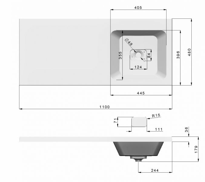 Одно отверстие под смеситель по центру чаши