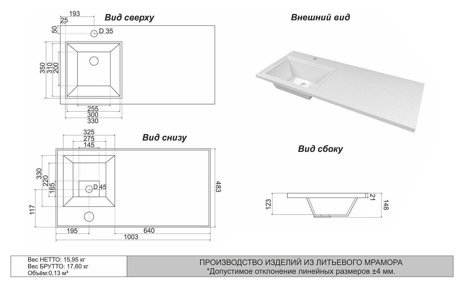 Тип: раковиныПо форме: прямоугольныеРазмер, мм (ШxГxВ): 1002x484x140Размер в упаковке, мм (ШxГxВ): 1032x514x170Цвет: белыйВес с упаковкой, кг: 23.24По монтажу: мебельнаяМатериал: литьевой мраморОсобенности: установка над стиральной машиной, со столешницей