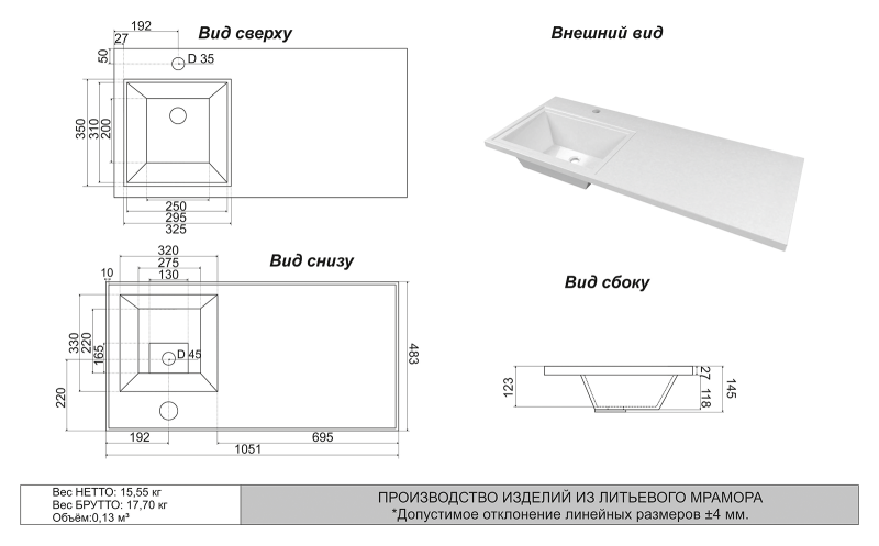 Тип: раковиныПо форме: прямоугольныеРазмер, мм (ШxГxВ): 1050x485x143Размер в упаковке, мм (ШxГxВ): 1080x515x173Цвет: белыйВес с упаковкой, кг: 17.9По монтажу: мебельнаяМатериал: литьевой мраморОсобенности: установка над стиральной машиной, со столешницей
