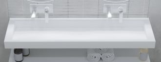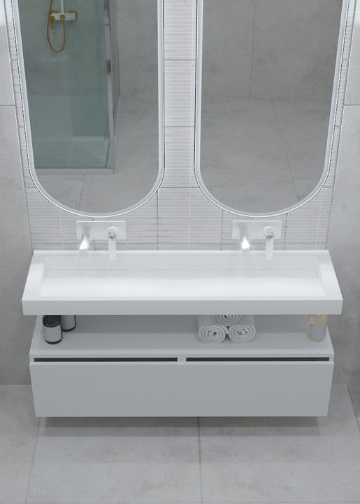 Раковины выполнены из матового Corian, в новаторском дизайне со скрытым сливом.