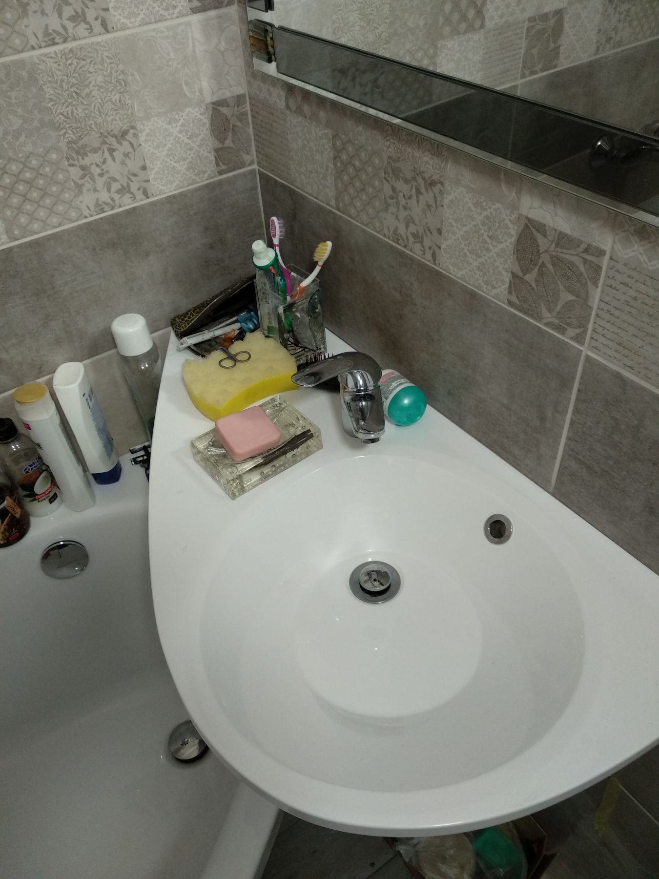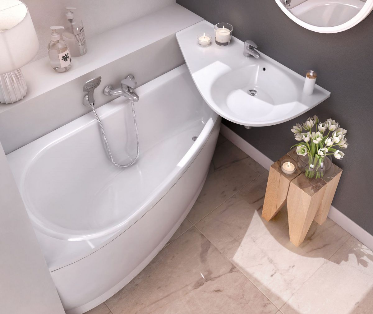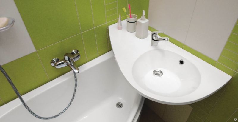 Умывальник с удобным моющим пространством и местом для вещей предназначен, прежде всего, для установки над ванной.