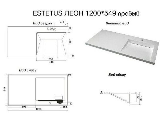 Раковина для мебели Style Line Estetus ЛЕОН 1200*549 со столешницей, материал искусственный камень.Расположение столешницы - слева.Слив-перелив и донный клапан приобретаются отдельно