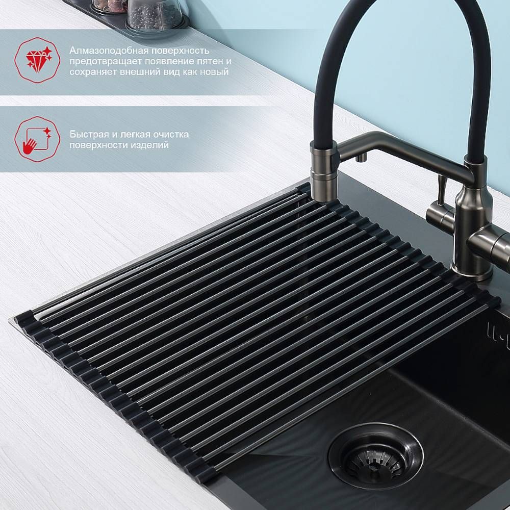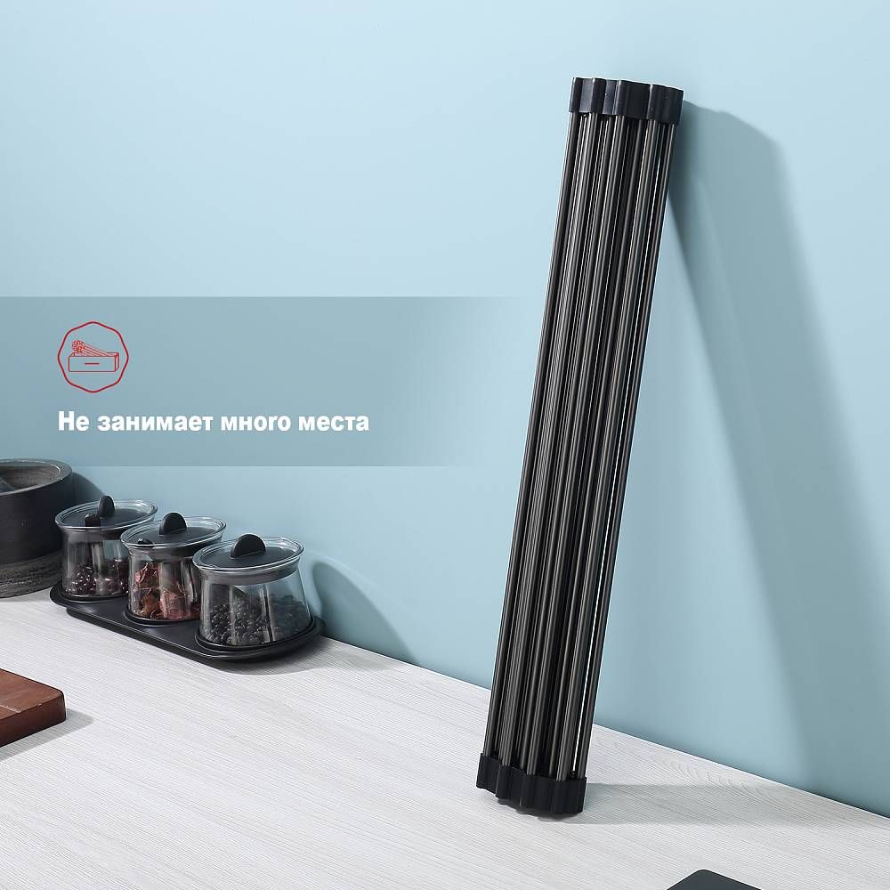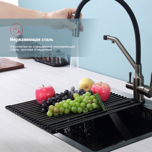 Ролл-мат из нержавеющей стали используются для мытья и просушивания посуды и продуктов. Устанавливаются на бортики мойки, можно использовать на крыле мойки или на кухонной столешнице в качестве подставки под горячую посуду. Гибкие силиконовые крепления по краям ролл-мата позволяют компактно свернуть его для хранения.