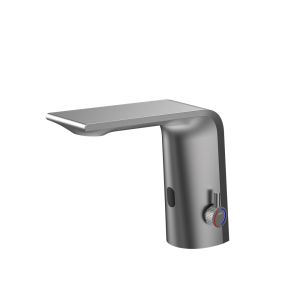 Смеситель для раковины датского производителя Black&White. Изделие изготовлено из сантехнической латуни – данный материал безопасен для здоровья и выдерживает высокое давление. Сверху корпус покрыт напылением в цвете оружейная сталь. Открытие воды происходит с помощью инфракрасного датчика, который работает на аккумуляторе постоянного тока. Данное решение гигиенично и экономит воду, особенно в общественных помещениях. Настройка температуры вынесена на ручку расположенную справа от снования. Комбинация округлого основания и плоского излива гармонично вольется в современные интерьеры ванной комнаты.