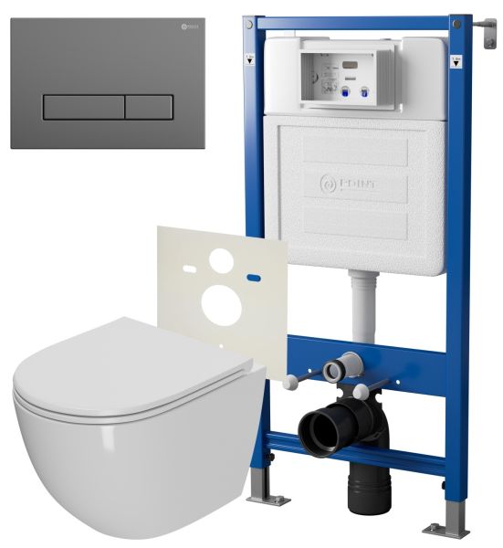 Сет: Система инсталляции Point Элемент для подвесного унитаза PN45120 + Клавиша смыва для инсталляции Point Меркурий, цвет графит, PN44831GM + Унитаз подвесной Point Афина безободковый, сиденье микролифт PN41041
