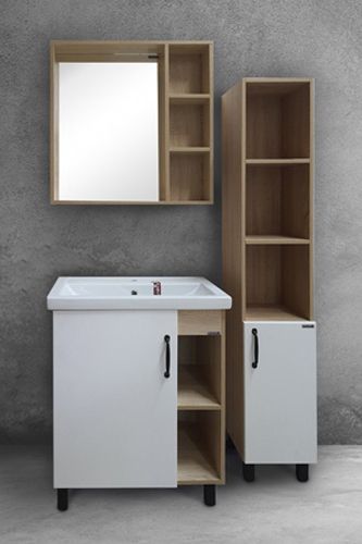 Компактные габариты позволяют грамотно организовать небольшой санузел, а пространство за распашной дверцей с механизмом плавного закрывания поможет разместить все необходимые вещи.