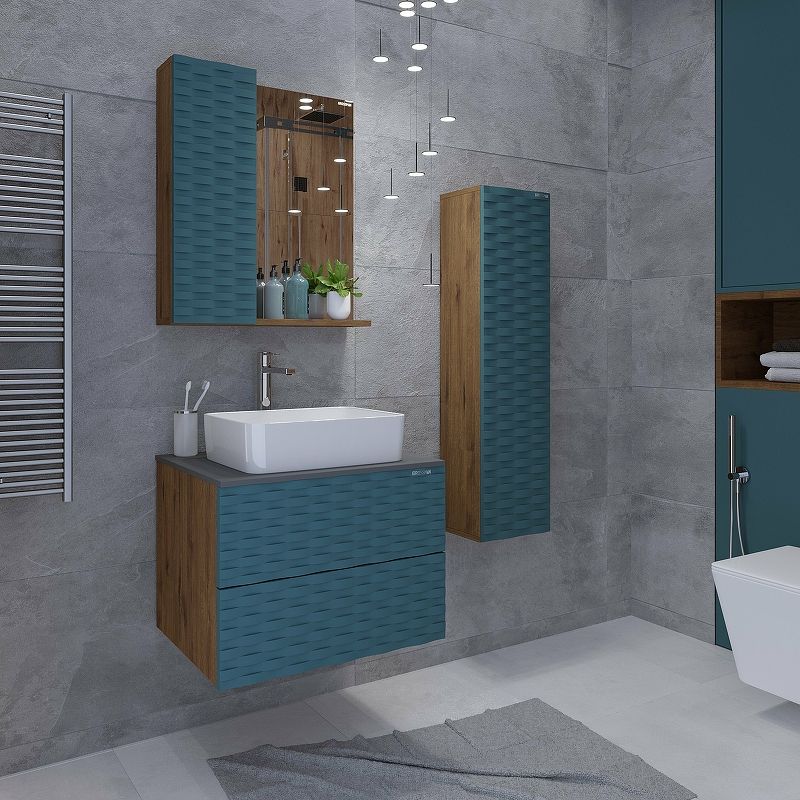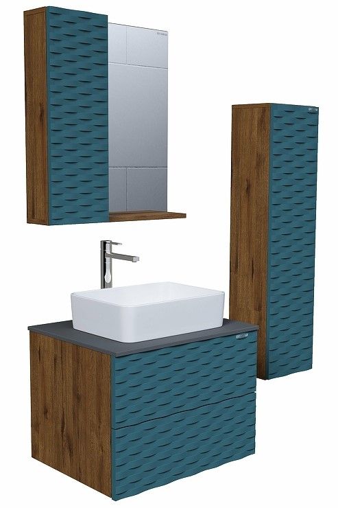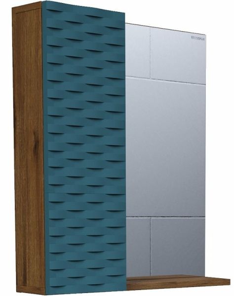 Шкаф-зеркало Альба-65 см отражает современные тенденции в дизайне мебели для ванных комнат: матовая пленка в цвете Бриз с 3D рисунком безупречно сочетается с текстурой под дерево , отсутствие лишних деталей.
