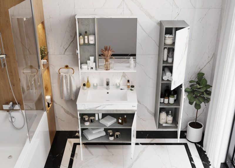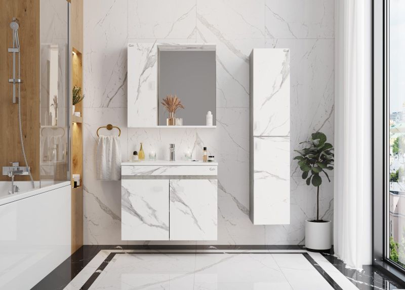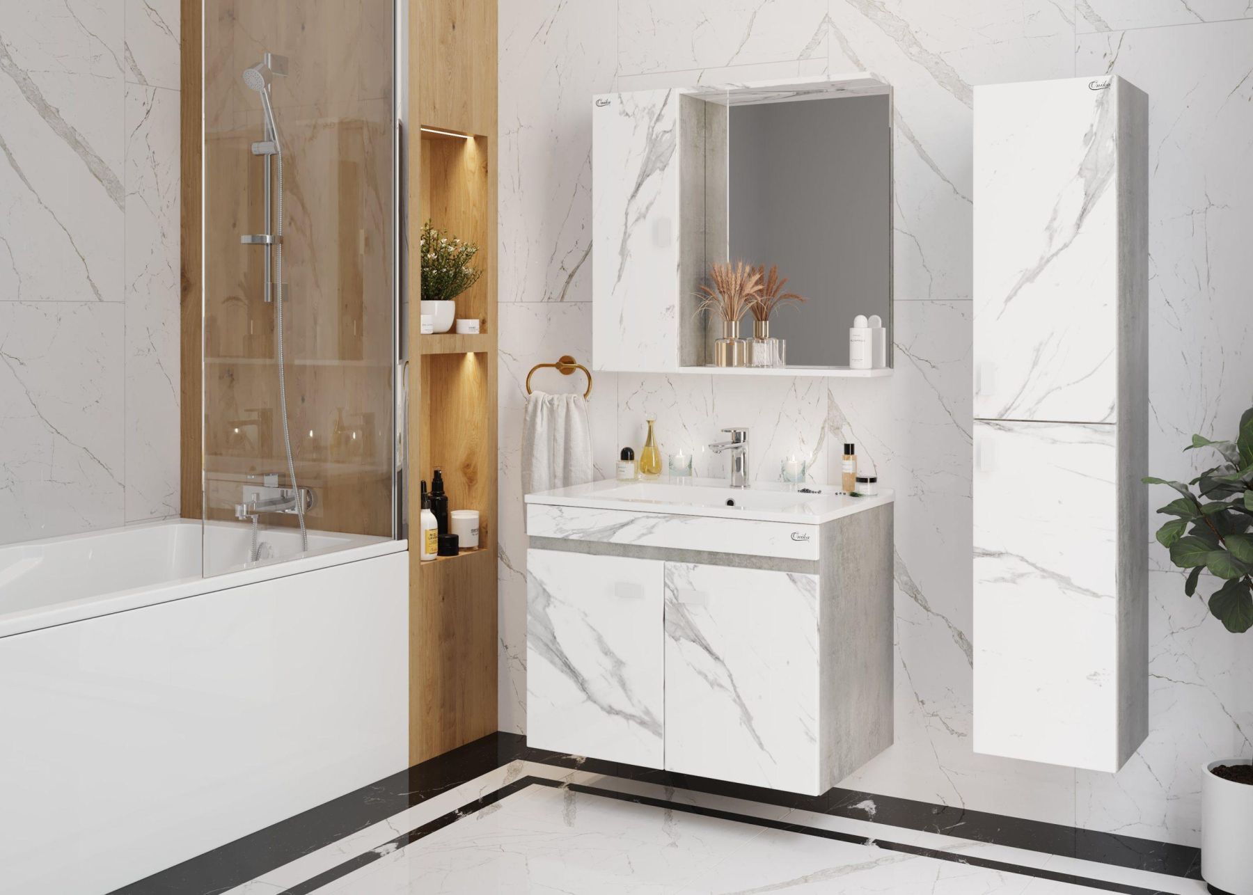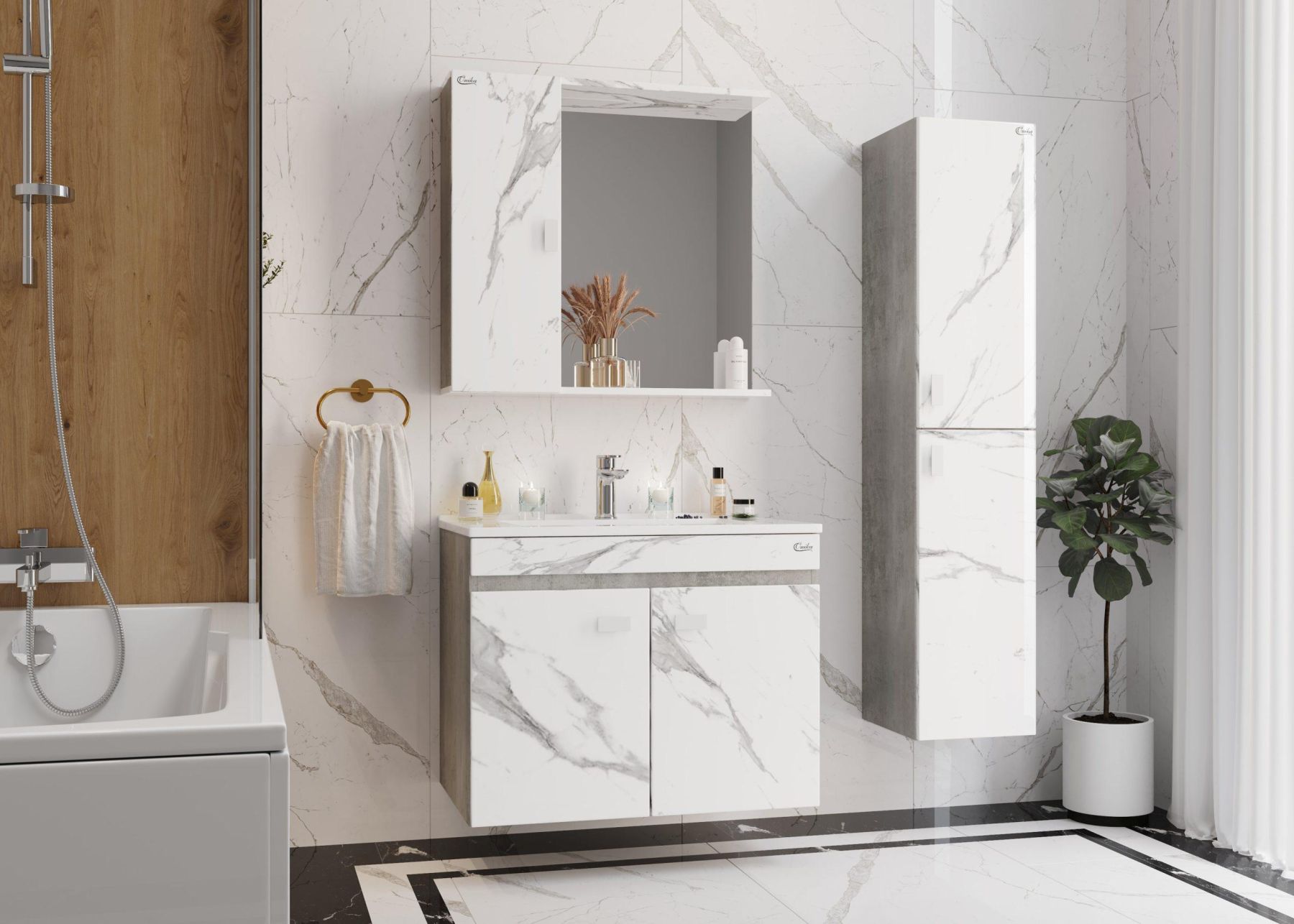 Шкаф-зеркало МАРБЛ 75 станет стильным и функциональным элементом пространства современной ванной комнаты. Спроектированный дизайнерами в минималистичном облике, зеркальный шкаф отражает самые актуальные расцветки сезона - бетон и мрамор.