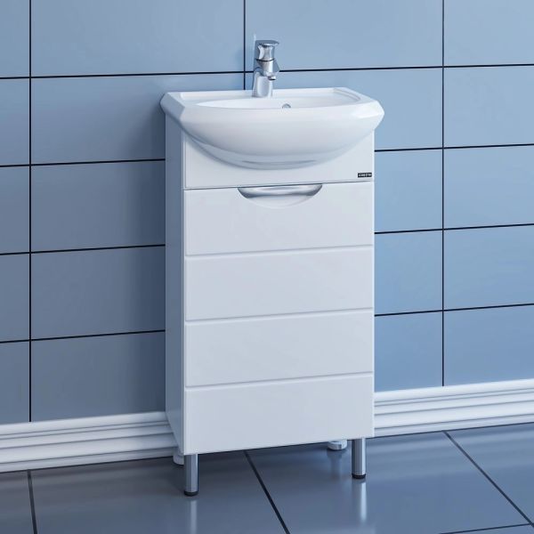 Несмотря на небольшие размеры, шкаф достойно выполнит задачу по хранению: пространство за распашной дверцей с механизмом плавного закрывания позволяет разместить необходимые мелочи, а открытые полки можно использовать для декора или часто используемых предметов.