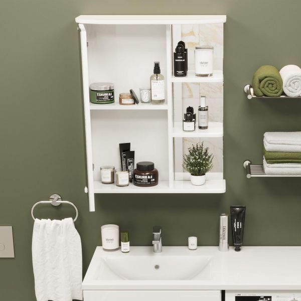 Открытые полочки справа обеспечивают быстрый доступ к часто используемым аксессуарам, а пространство за распашной зеркальной дверцей с механизмом плавного закрывания, разделенное двумя полочками, станет удобным местом для хранения различных бытовых принадлежностей.