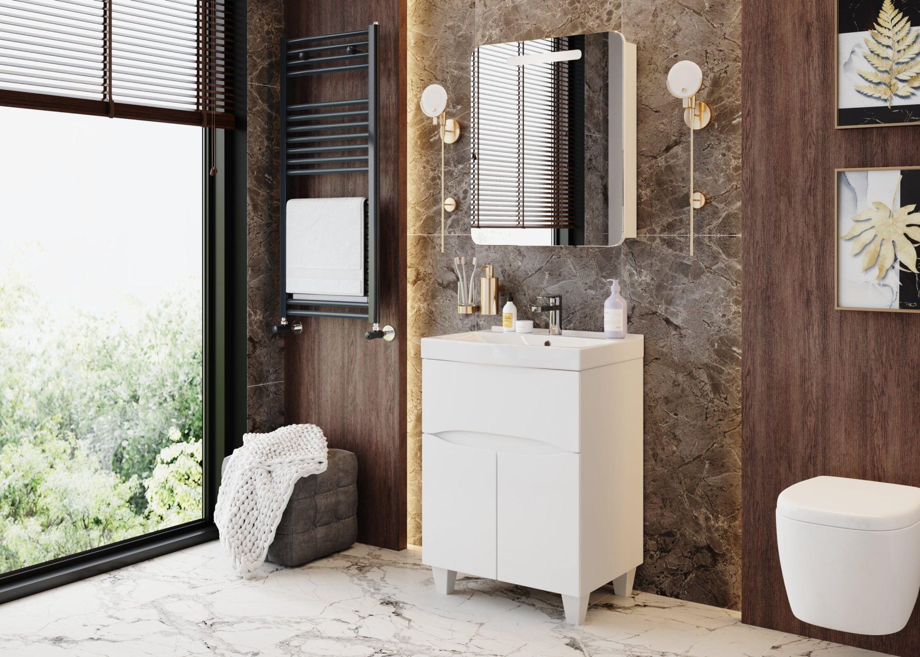 Дверца с механизмом плавного закрывания - она же зеркальный фасад со скошенными углами и светодиодной подсветкой, скрывает вместительное пространство для хранения, разделенное стеклянной полочкой с еврокромкой.