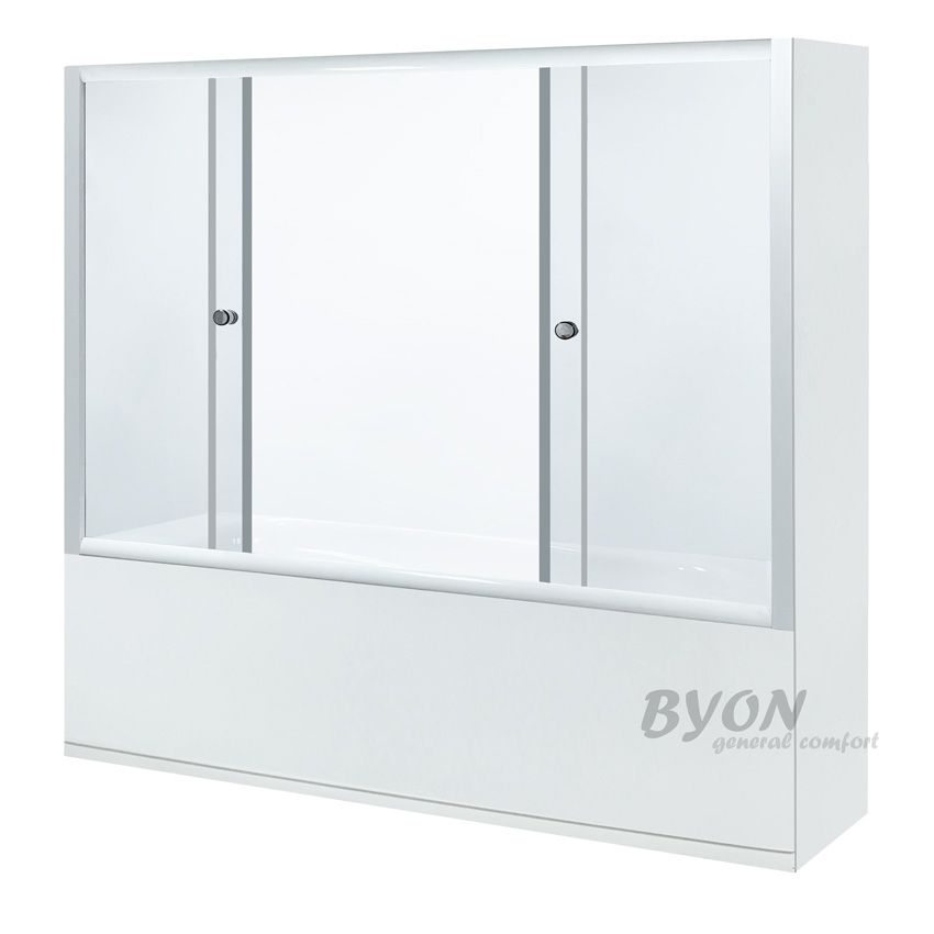 Крепления в комплекте.Продукция «BYON» создаётся для комфортной, безопасной и длительной эксплуатации. Каждый элемент конструкции способствует решению этой задачи. Штора на ванну выполнены из широкого алюминиевого профиля белого цвета в наполнении прозрачное безопасное закаленное стекло 5 мм, которое не образует острых осколков при ударе. Центральный вход. Механизм передвижения створок работает на основе двойных верхних и одинарных нижних роликов. Устанавливается штора на ванну между стен и крепится к ним, создавая таким образом закрытый душевой бокс. Благодаря широкому установочному профилю штору просто монтировать даже на неровные стены (допустимы неровности стены до 30 мм)