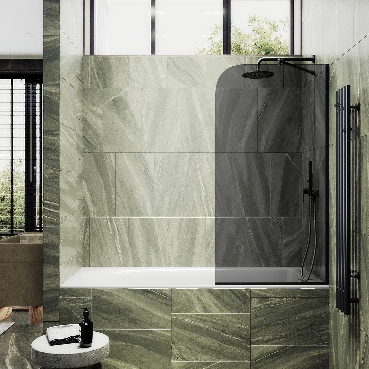 Монтаж осуществляется с помощью алюминиевого профиля, что обеспечивает надежность крепления и безопасность использования стеклянной перегородки для ванной. Также, шторка оснащена специальным уплотнителем, который предотвращает попадание воды на пол ванной комнаты. Закаленное стекло, цвет Графит, толщина 6 мм 1400х440 мм - 1 шт.