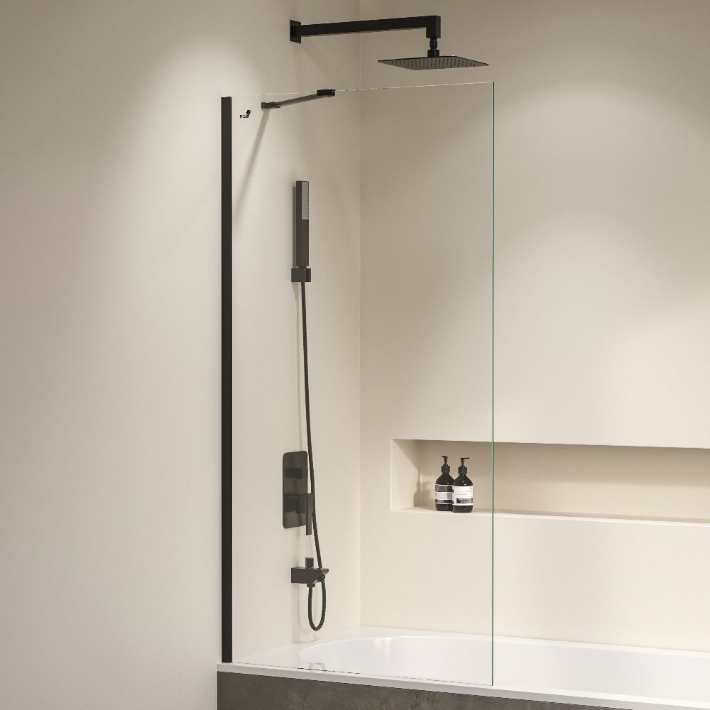 Неподвижная шторка на ванну - это, современное решение, которое придает аккуратный и эстетичный вид ванной комнате и защищает пол и обстановку от попадания воды.Уникальная конструкция позволяет адаптировать шторку к особенностям стен, нивелируя возможные неровности, а функция универсальной установки позволит закрепить ее на любой стороне ванны.Устойчивое прочное стекло толщиной 6 мм, закаленное при высоких температурах, выдерживает даже случайные точечные удары и обрамлено профилем насыщенного черного цвета, выполненным из анодированного алюминия для защиты от влаги и перепадов температуры, что продлевает срок службы изделия до 15 лет.Диагональный пристенный держатель позволяет выбрать любое положение верхнего душа, которое будет удобно для роста пользователей.