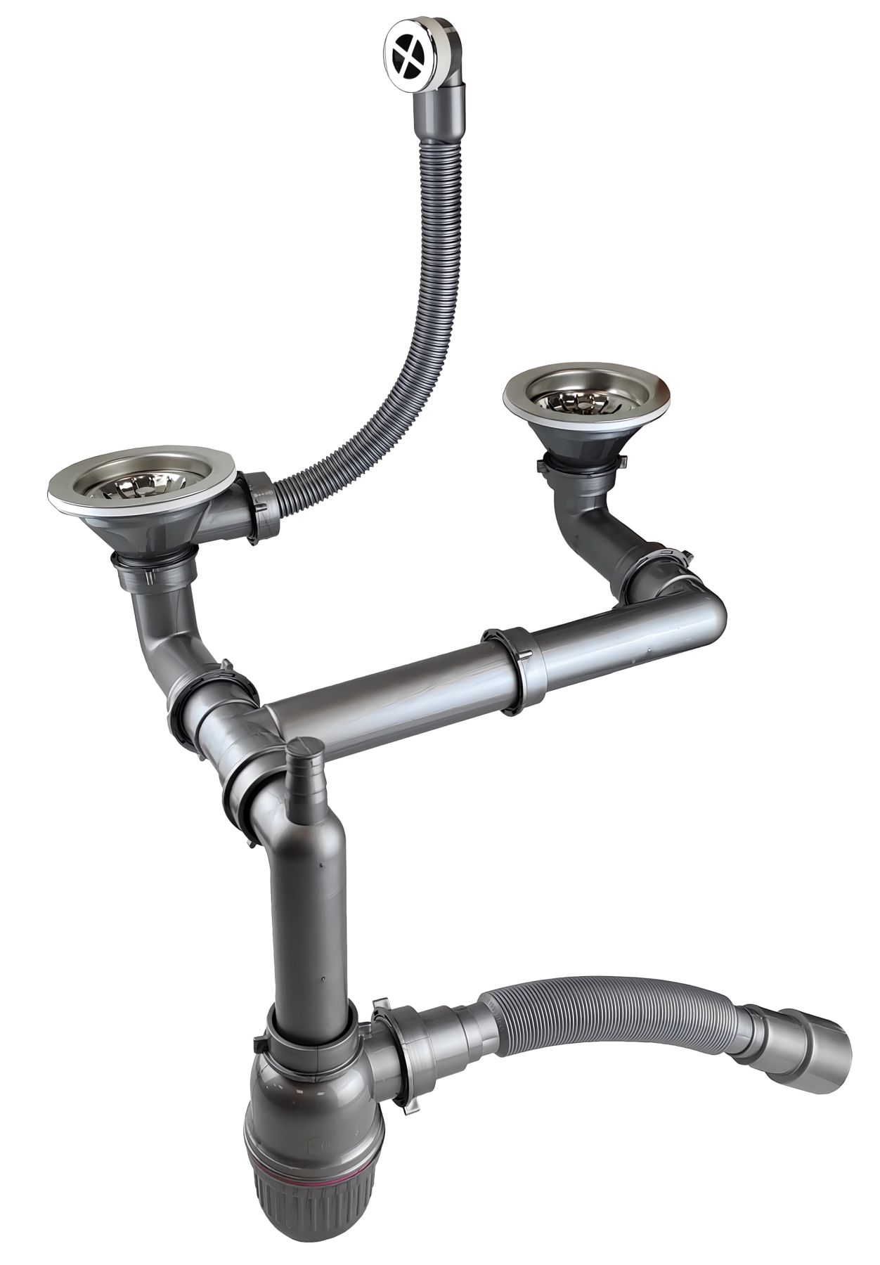 Сифон для кухонной мойки на две чаши Практичный и функциональный сифон для двойной кухонной мойки с регулируемой длиной и высотой для удобного монтажа. Подходит для моек из нержавеющей стали и искусственного камня. В комплекте — универсальный крепеж, два варианта переливов и запатентованный гибкий переходник для быстрого и надежного подключения. Ключевые преимущества: ? Запатентованный гибкий переходник — упрощает монтаж и обеспечивает герметичность? Регулируемая конструкция — подстраивается под межосевое расстояние (210–370 мм) и угол между чашами (60°–90°)? Универсальный крепеж — подходит для моек из нержавеющей стали и искусственного камня? Отвод для посудомоечной/стиральной машины — удобное дополнительное подключение? Два дизайна переливных решеток в комплекте — для гармоничного сочетания с мойкой? Высокая пропускная способность — до 55 л/мин Технические характеристики: - Габариты: 290?520?350 мм - Регулируемая длина гофры: 360–810 мм - Регулируемая высота: до 10 см - Диаметр слива: 90 мм - Диаметр чаш: 114 мм - Диаметр фильтр-пробок: 80 мм - Подключение к канализации: 40/50 мм Комплектация: - Универсальные евроболты (40 мм) - 2 вида переливов + переходник на 90° - Набор уплотнителей для герметичности Идеальное решение для современной кухни с двойной мойкой — простота установки, надежность и стильный дизайн!