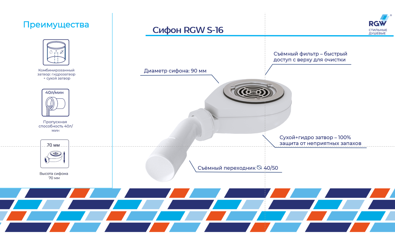 Cифон для душевых поддонов RGW S-16 имеет ключевые преимущества: