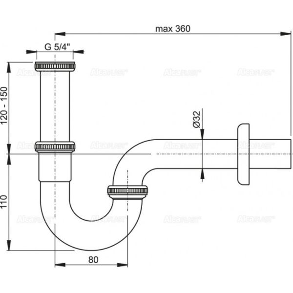 Сифон для раковины AlcaPlast ?32 U-форма цельнометаллический с накидной гайкой 5/4" A4320 купить