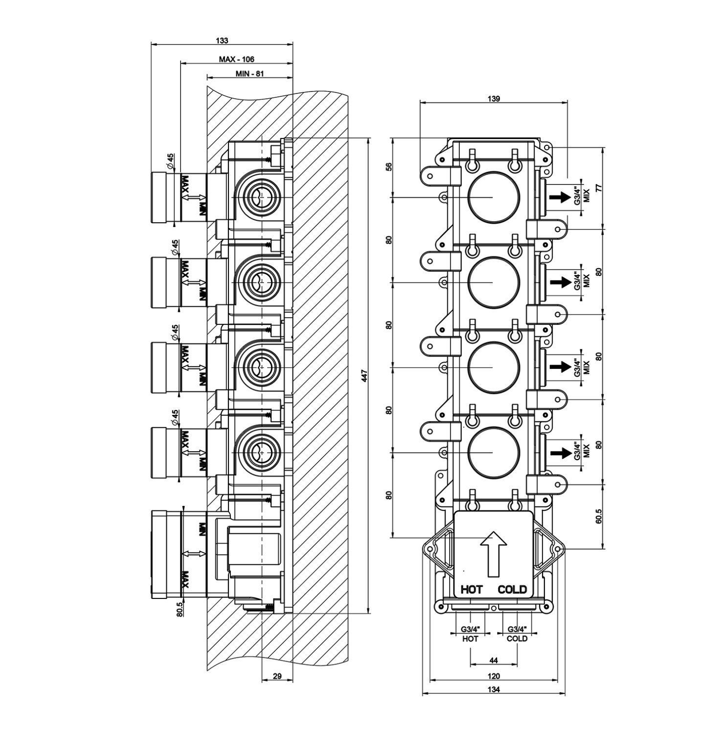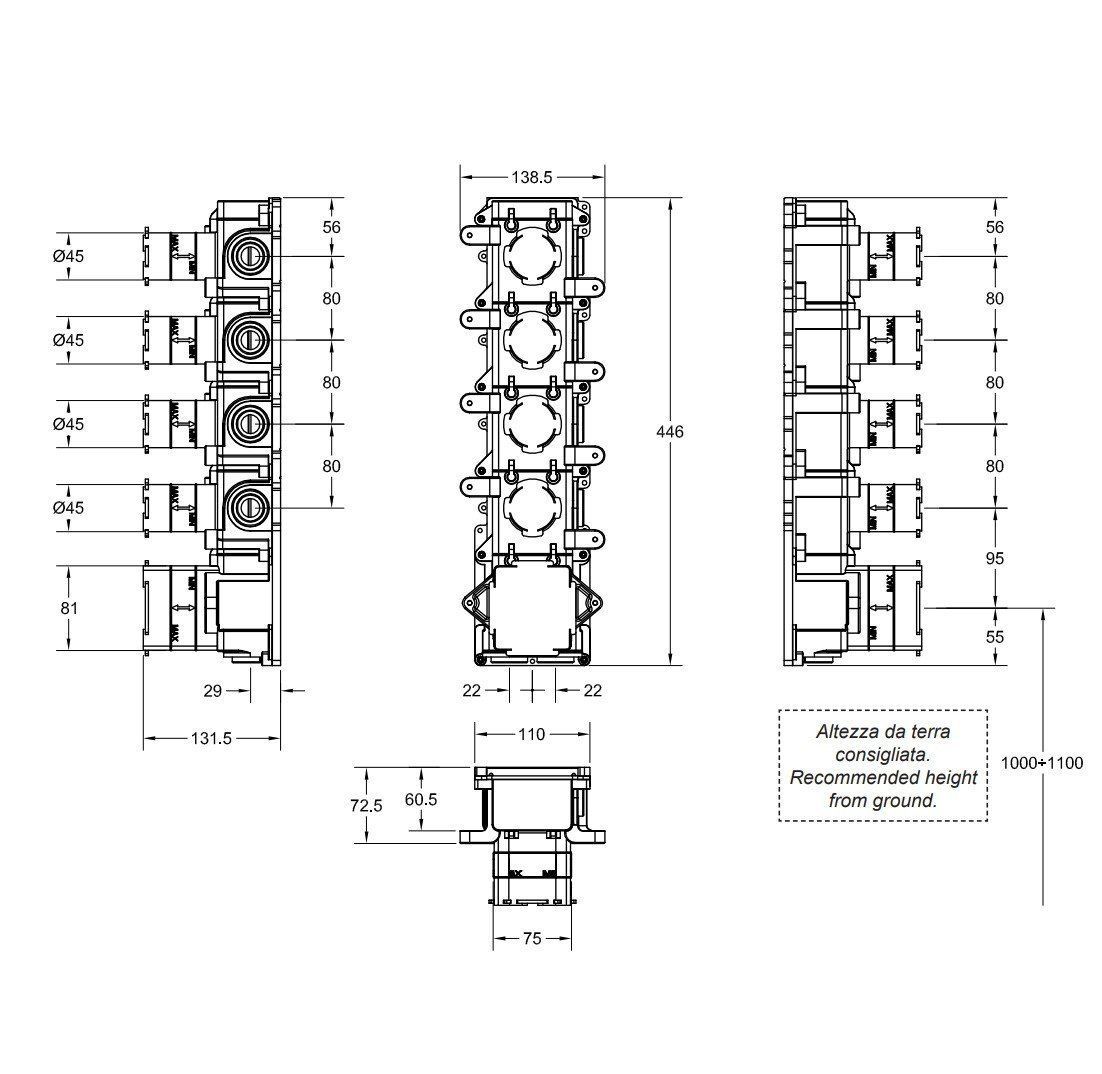 Скрытая часть Gessi Inciso для термостата высокой производительности — это первоклассное решение для современных ванных комнат. Она предлагает возможность подключения как в вертикальном, так и в горизонтальном положении, что обеспечивает гибкость установки в любых условиях. Элегантный хромированный цвет придает изделию стильный и современный вид, подчеркивающий дизайнерский подход.