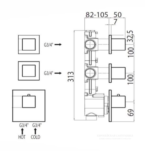 Скрытая часть термостата Bossini Z030203000 на три потребителя купить
