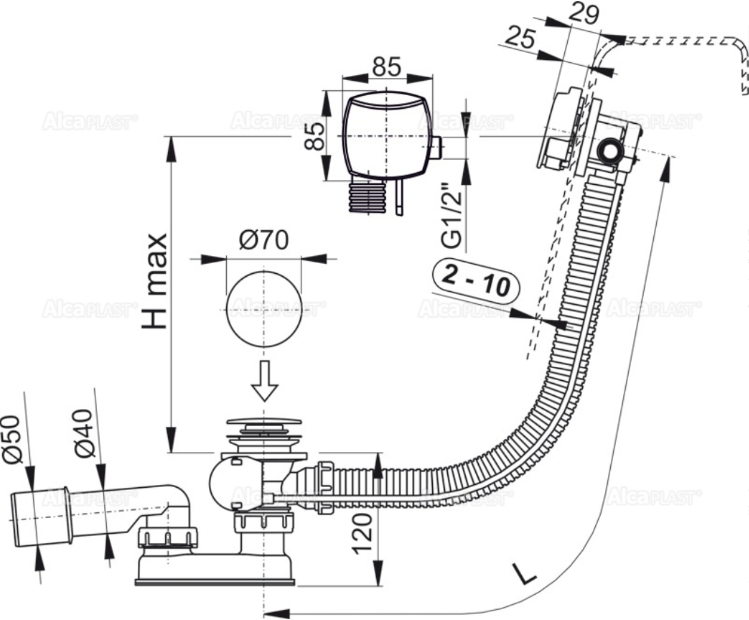 - Для ванн с выпускным отверстием Ø52 мм