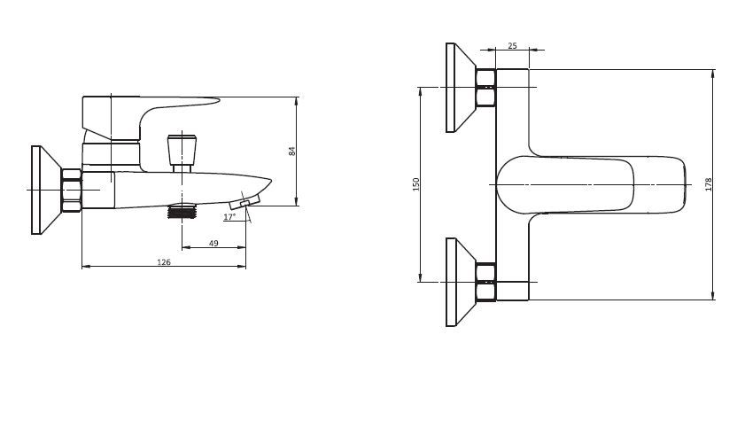 Настенная установка; Длина излива 104 мм; Выход для душа 1/2'’ Эксцентрики и декоративные чашки в комплекте.