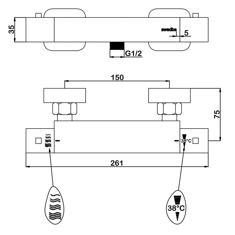 Термостат для душа Swedbe Mercury — надёжный смеситель от шведского бренда Swedbe. Оснащён «умным» картриджем. Благодаря обратным клапанам решается проблема «выдавливания» холодной воды горячей из-за разницы давления, когда температуру воды отрегулировать невозможно. Клапаны чётко разделяют холодную и горячую воду, исключая подмес. Это важно в тех домах, где есть сильная разница давления в стояках. В моделе предусмотрен ограничитель температуры, предустановленный на отметке 38 градусов, что считается идеальным значением для комфортного мытья. Можно не бояться обжечься при повороте рукоятки температуры, что актуально для семей с маленькими детьми.