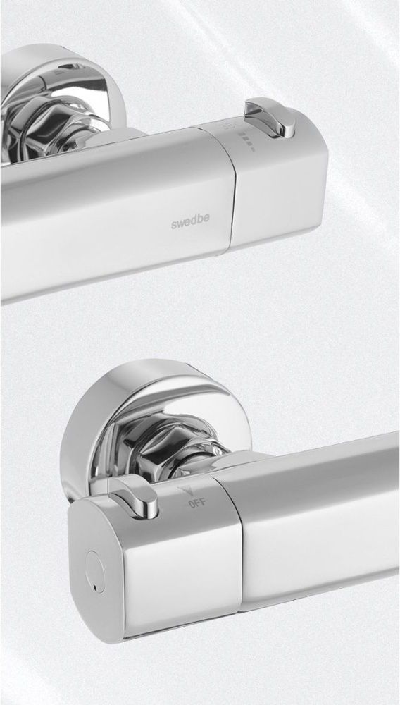 Термостат для душа Swedbe Mercury — надёжный смеситель от шведского бренда Swedbe. Оснащён «умным» картриджем. Благодаря обратным клапанам решается проблема «выдавливания» холодной воды горячей из-за разницы давления, когда температуру воды отрегулировать невозможно. Клапаны чётко разделяют холодную и горячую воду, исключая подмес. Это важно в тех домах, где есть сильная разница давления в стояках. В моделе предусмотрен ограничитель температуры, предустановленный на отметке 38 градусов, что считается идеальным значением для комфортного мытья. Можно не бояться обжечься при повороте рукоятки температуры, что актуально для семей с маленькими детьми.