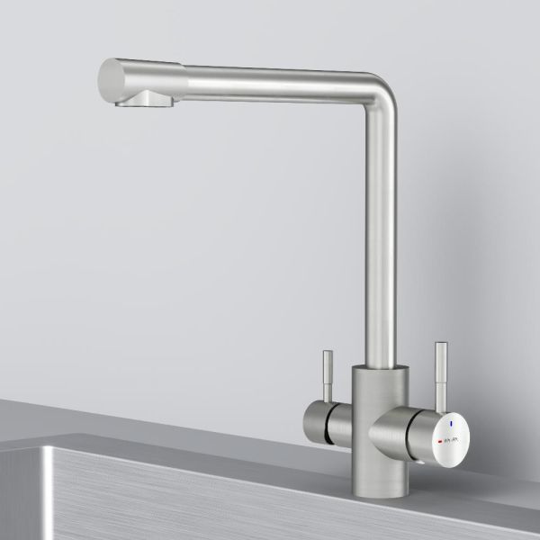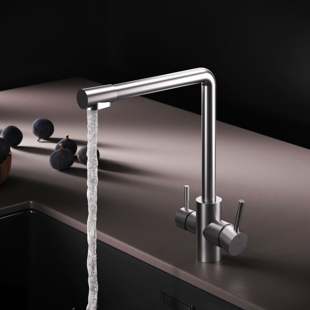 Смеситель оснащен встроенным каналом для питьевой воды. Для получения питьевой воды воспользуйтесь ручкой, расположенной с левой стороны корпуса, для получения обычной воды, просто управляйте смесителем привычным способом.