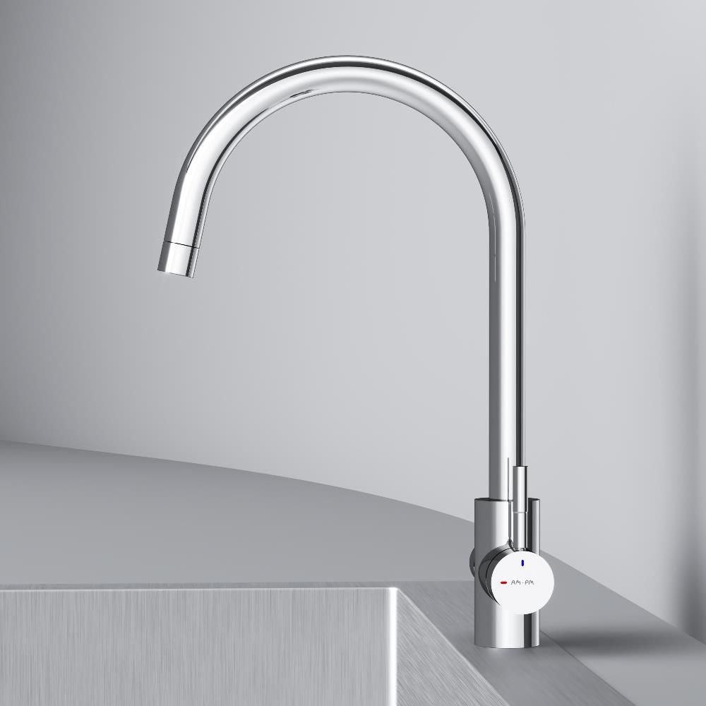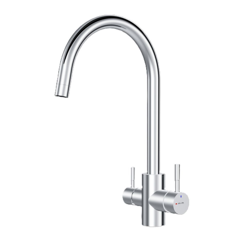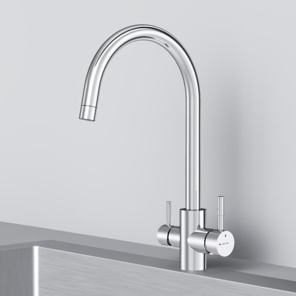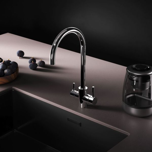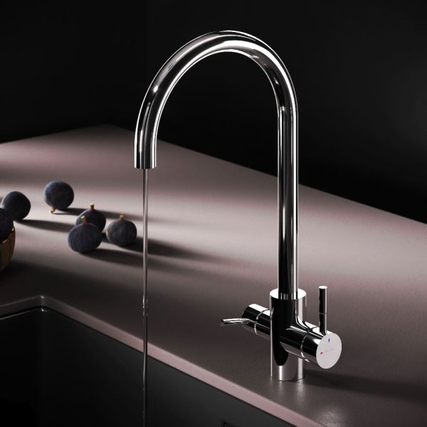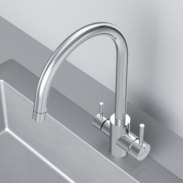 Смеситель оснащен встроенным каналом для питьевой воды. Для получения питьевой воды воспользуйтесь ручкой, расположенной с левой стороны корпуса, для получения обычной воды, просто управляйте смесителем привычным способом.
