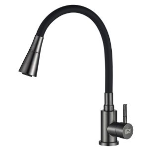 Cмеситель MIA GR из нержавеющей стали для кухни BOCH MANN BM10422 с гибким изливом черного цвета - уникальная модель, которая подходит для кухонных моек, раковин , умывальников. Силиконовый гибкий излив абсолютно безопасен, т.к он изготовлен из высококачественных материалов. Материал корпуса- нержавеющая сталь. Смеситель имеет керамический картридж 35 мм. Особенность данного смесителя - способность изменять форму и высоту излива, благодаря чему вы можете доставать до емкостей, находящихся рядом с мойкой. Излив надежно фиксируется и не деформируется от постоянных сгибов.