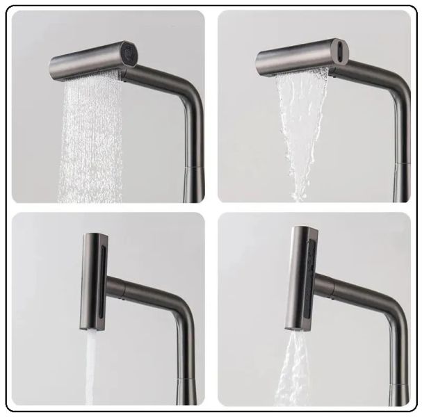 - Лейка имеет 4 режима: режим-1 "стандарт" (через аэратор), режим-2 "лезвие" (плоская струя с усиленным напором), режим-3 "ливень" (принцип душевой лейки); режим-4 "каскадный водопад"