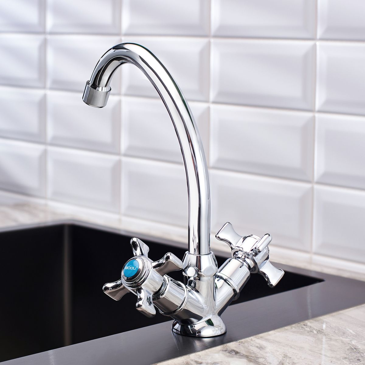 Смеситель ТМ BOOU это классическая двуручковая модель для кухонной мойки. Трубчатый излив в форме буквы J удобен для наполнения высоких емкостей и мытья габаритной посу-ды. При необходимости он поворачивается на 360°, высвобождая пространство над мойкой для выполнения бытовых задач.