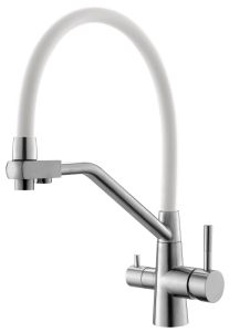 Смеситель для кухни ESKO Kitchen K26 W белыйСмеситель K26 W: Инновационный смеситель для кухни с гибким изливом из нержавеющей стали и функцией подключения к фильтру. Белый корпус с стальными элементами создает стильный контраст. Удобный излив 21,5 см и возможность фильтрации воды делают его незаменимым на современной кухне.