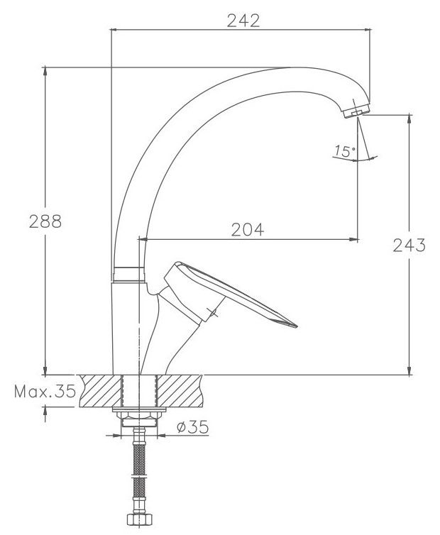 Смеситель для кухни бренда Haiba.Изготовлен из латуни.Картридж 40 мм.Укомплектован аэратором.Гибкая подводка 40 см.С поворотным изливом.