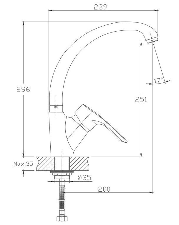 Смеситель для кухни бренда Haiba.Изготовлен из латуни.Картридж 35 мм.Укомплектован аэратором.Гибкая подводка 40 см.С поворотным изливом.