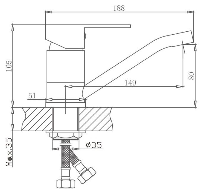 Смеситель для кухни бренда Haiba.Изготовлен из нержавеющей стали.Картридж 40 мм.Укомплектован аэратором.Гибкая подводка 40 см.С поворотным изливом.