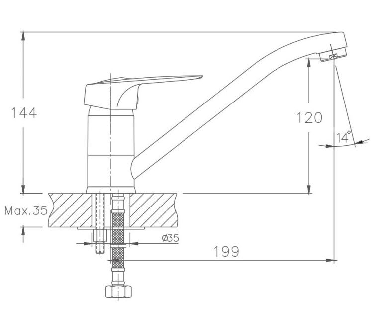 Смеситель для кухни бренда Haiba.Изготовлен из латуни.Картридж 35 мм.Укомплектован аэратором.Гибкая подводка 40 см.С поворотным изливом.