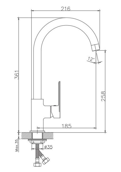 Смеситель для кухни бренда Haiba.Изготовлен из латуни.Картридж 30 мм.Укомплектован аэратором.Гибкая подводка 40 см.С поворотным изливом.
