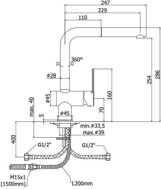 Смеситель для мойки с поворот.изливом и выдвижным 1 режим.душем из ABS, Черный матовыйСмеситель для кухни Paffoni Ringo RIN185NO.ВНИМАНИЕ! В монтажной схеме указан европейский стандарт подводки 3/8, мы предлагаем комплект, адаптированный к российским условиям, со стандартом подводки 1/2.Комплектация: