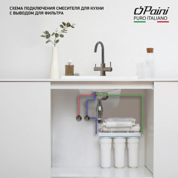 Оптимизируем мокрую зону на кухне со смесителем PAINI COX на 3 воды! Однорычажный смеситель классической формы, но с одной важной деталью: фильтр для воды подключается прямо к смесителю. Легкий монтаж без дополнительных отверстий в столешнице, теперь для доступа к питьевой воде нужно просто повернуть рычаг на корпусе смесителя. Смеситель представлен в необычных цветах, что дает простор творчеству и позволяет сочетать его с мойками и кухонной мебелью разных фактур и материалов.Разнообразие цветаТри варианта бежевого цвета: сахара, бежевый с вкраплениями (гранит) и нежный трюфель, а также белый с вкраплениями (гранит) и комбинация черного и хромого цветов в корпусе смесителя. Теперь точно получится попасть в цвет столешницы и/или цвет мойки либо создать контрастные сочетания. Все варианты покрытия, включая покрытие под камень, выполнены по специальной технологии, сохраняющей цвет и фактуру надолго и облегчающей уход за смесителем.3 воды в одном корпусеПодключение фильтра для воды прямо к смесителю.Европейское качествоСделано в Италии. Гарантия – 5 лет.Технологии гарантируют долгий срок службыФабрика «Паини» использует только лучшие комплектующие. Аэратор Neoperl наполняет поток воды кислородом, увеличивает напор, экономя воду. Одно движение пальцем для очистки сеточки. Керамический картридж Nuovo Galatron – основа, необходимая для долгой работы смесителя.Легкая уборкаНесколько движений – и готово. Мыльная губка и сухая тряпочка – все, что нужно для уборки.