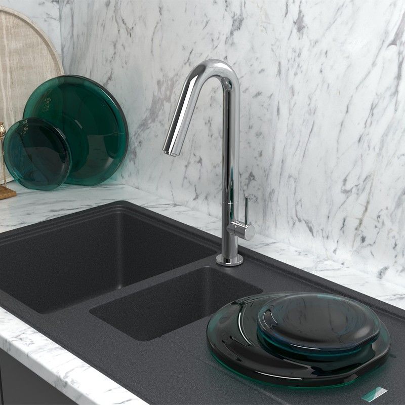 - Высокий корпус и поворотный излив дает больше возможностей при использовании на кухне.
