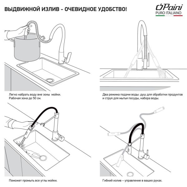 Все дело в цвете! Решение, повышающее функциональность современной кухни – однорычажный смеситель COX с выдвижным изливом. Выдвижной излив – это преимущество, облегчающее жизнь. Помыть большую кастрюлю или, например, арбуз? Этот смеситель освободит руки, с помощью мобильной лейки можно вымыть объемный предмет или наполнить емкость рядом с раковиной. Смеситель представлен в необычных цветах, что дает простор творчеству и позволяет сочетать его с мойками и кухонной мебелью разных фактур и материалов.Разнообразие цветаТри варианта бежевого цвета: сахара, бежевый с вкраплениями (гранит) и нежный трюфель, а также белый с вкраплениями (гранит) и комбинация черного и хромого цветов в корпусе смесителя. Теперь точно получится попасть в цвет столешницы и/или цвет мойки либо создать контрастные сочетания. Все варианты покрытия, включая покрытие под камень, выполнены по специальной технологии, сохраняющей цвет и фактуру надолго и облегчающей уход за смесителем.Выдвижной изливПодвижная 2-х режимная лейка дарит больше возможностей при использовании.Европейское качествоСделано в Италии. Гарантия – 5 лет.Технологии гарантируют долгий срок службыФабрика «Паини» использует только лучшие комплектующие. Аэратор Neoperl наполняет поток воды кислородом, увеличивает напор, экономя воду. Одно движение пальцем для очистки сеточки. Керамический картридж Nuovo Galatron – основа, необходимая для долгой работы смесителя.Легкая уборкаМыльная губка и сухая тряпочка – все, что нужно для уборки. Несколько движений – и готово.