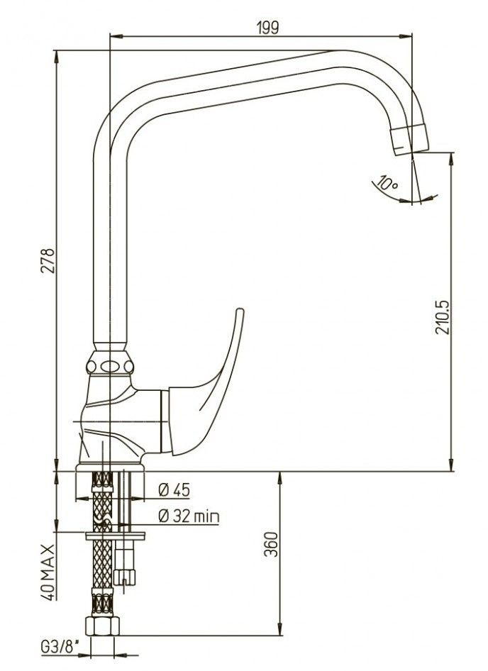 - Высокий поворотный излив для комфортного использования на кухне.