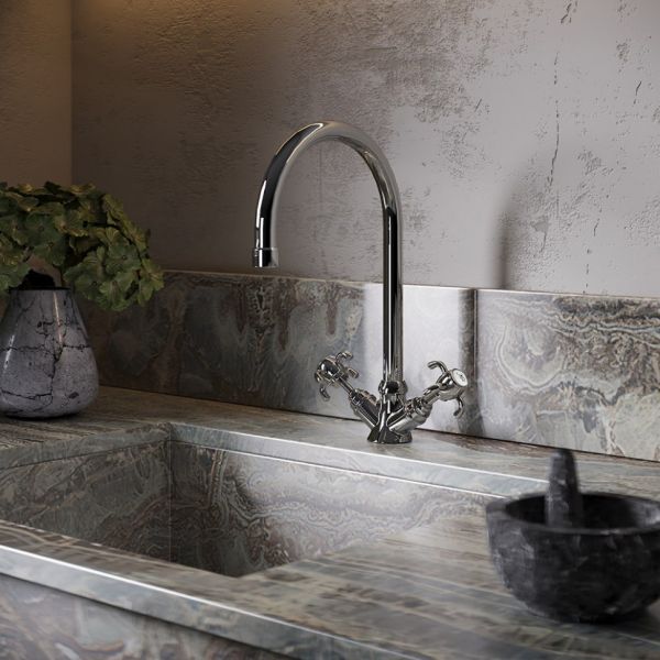 - Высокий корпус и поворотный излив дают больше возможностей при использовании на кухне.