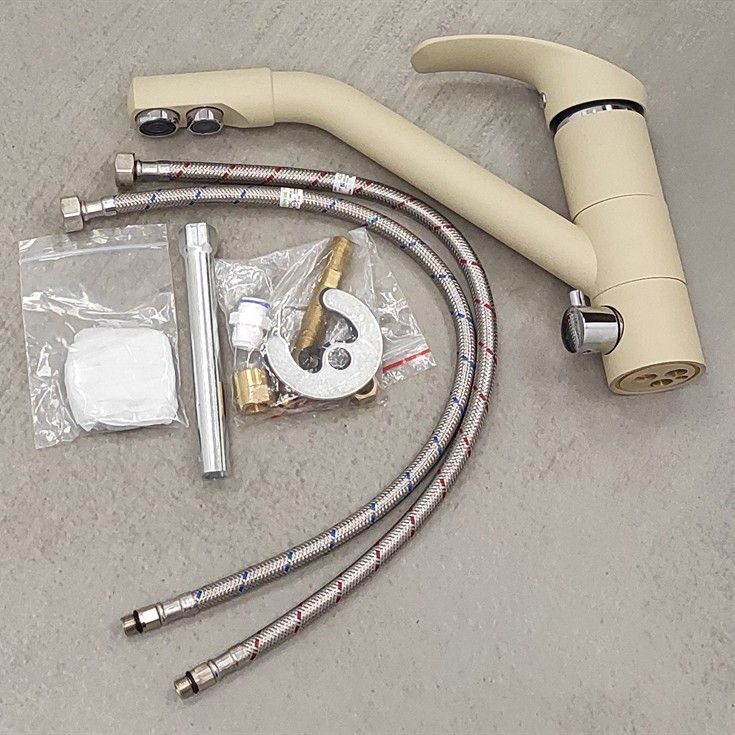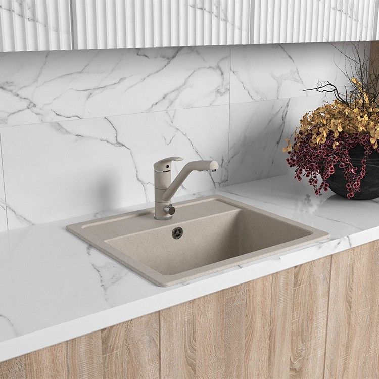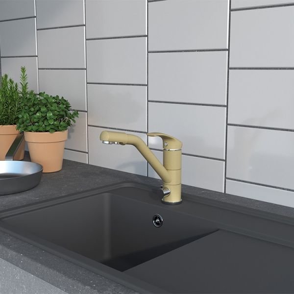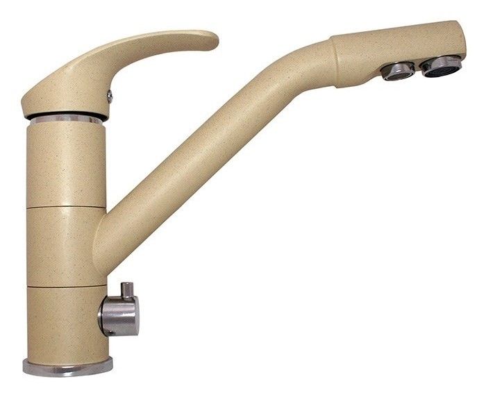 - Корпус из латуни с покрытием бежевый гранит подходит для популярного цвета моек, удобен в уходе.